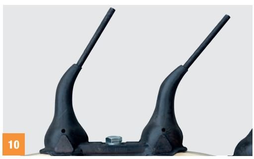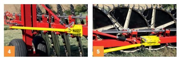 A stop with a safety bolt attached to the sections at each rake wheel lifting arm ensures the stability of the rake wheels during transport. This system also protects the rake wheel lifting arms from accidental knocks and blows while working, since it has been dimensioned so that the safety bolt snaps before the arms get bent.