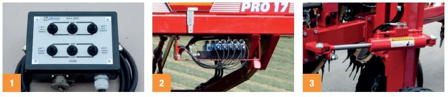 Ali PR0/17 operating functions are carried out from a control board to be placed in the cabin. The control board is fed by the 12 V, D.C. tractor battery through the relevant cable. It must also be connected to the feeding cable of the machine's electrohydraulic group through a multiple plug which is easy to connect and disconnect. This allows to open and close the rake crosspiece (frame), adjust the angle of the raking sections separately on the right and on the left side, to lift and lower the raking wheels separately on the right and on the left side and to lift or lower them simultaneously on both sides by simply pressing the contrai board keys, which in turn activate the relevant valves to which they are connected. The valve group also contains an open-closed selector which adapts to various hydraulic circuits in the tractors with no need to remove or add anv devices.