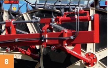 Each wheel can be regulated with the correct pressure on the ground through an adjustable rod connected to the relevant spring. A chain adequately anchored to the wheel lifting bar and to the wheel arm ensures a preset and sure stop to the wheel descent towards the ground. All these adjustments are individual for each single wheel. It also possible to adjust all wheels on each side by operating an adjustable sleeve located on the wheellifting cylinders.