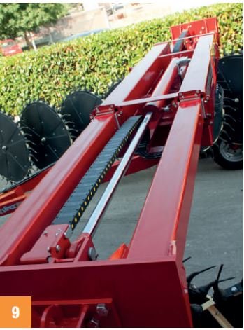 A centrai frame made of double·section structural pipes stabilizes the machine frame in irregular fields. Fully open frame allows far 29’ raking width.