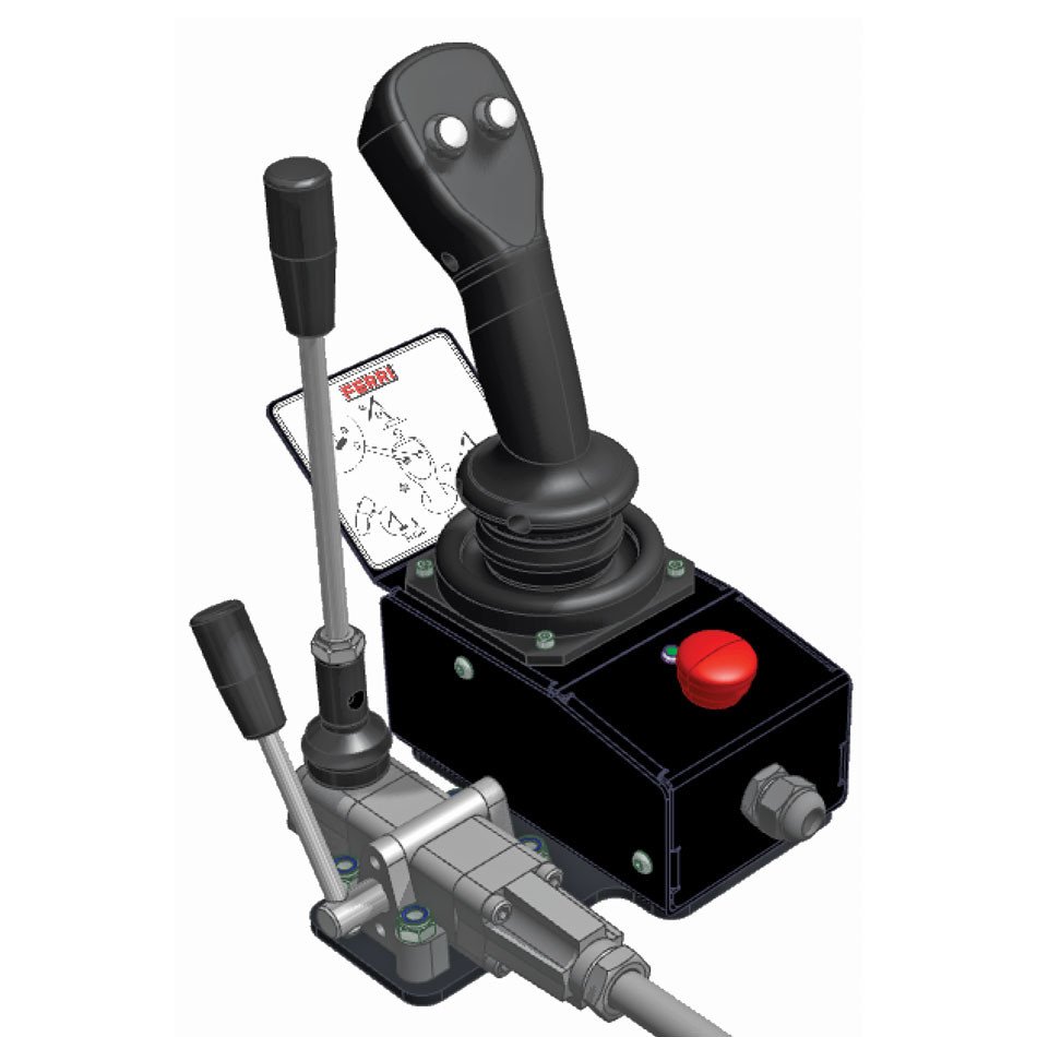 The distributors are actuated by means of a mixed system. The joystick controls the function of the first and second booms, while the head inclination is a electrically controlled via the buttons above the joystick. Rotor movement is carried out via a flexible cable control.