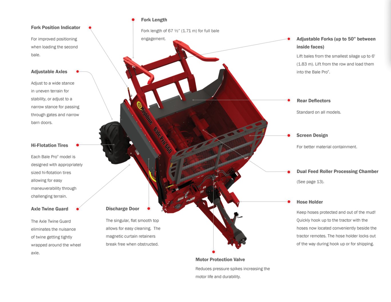 The BP 660 Bale Pro® is a great option for cattle operations looking for a durable, well-engineered bale processor. The BP 660 Bale Pro® has a dual feed roller processing chamber with a centrally driven flail drum. The Highline® flails efficiently bite into the bale for uniform feed processing. The flails are optimally sized to grab the bale. The new stepped shaft design is machined from a single length of material vastly improving strength and durability of the drum. The flails are designed in a spiral formation. This spiral formation ensures that the bale is continuously pulled and processed resulting in consistent feed. Also, the flail drum is digitally balanced for smooth performance and long bearing life. |
