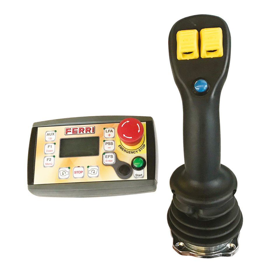 The DS-Tronic Dual control: allows easy portability of the control in the cab thanks to a lightweight joystick and the absence of hydraulic hoses. The joystick is connected by an electric cable to a control unit mounted on the distribution valves. The buttons on the display allow entry of the machine START/STOP functions and rotor start/stop. Each button has an LED indicator that shows whether the function is on or off.