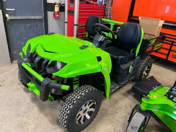 two wheel drive electric utility vehicle with electricnbox dump, easy on off access, two range, 8kWh on boardnbattery, up to 100 km per charge, canopy