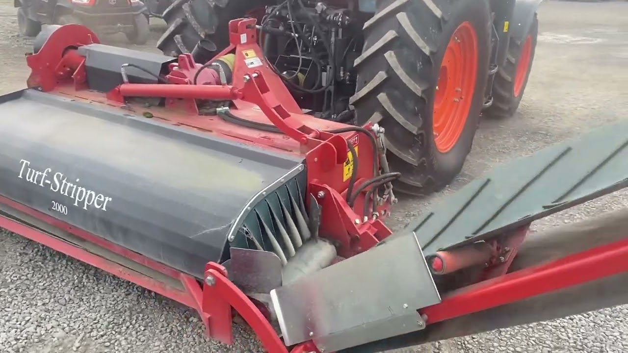 Redexim Turf-Stripper 2000 (Fraise Mowing)nThe Turf-Stripper 2000 fraise mower removes turf, weedsnand thatch from sports fields quickly and accurately. Ansidearm conveyor transfers the debris into a trailer.nworking width : 79"nmax. working depth: 2"ndrain height: 67"nmax. working speed: 3km/hrnmachine weight: 2,908lbnmin. tractor hp required: 40-50nmin. lifting capacity: 3,640lbnrequired connections: 2 x double acing valventhree point hitch: 3-point CAT.2nRPM max.: 540ngearbox oil: SAE 140nlubricant: EP2