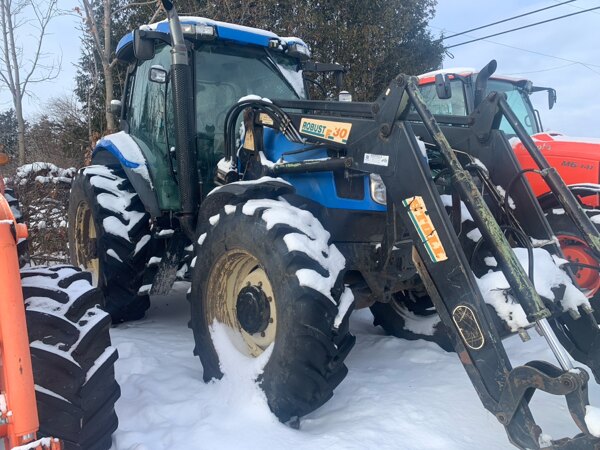 Used New Holland TS115A 4wd tractor with 16x16npowershift transmission, clutchless shuttle, 5900hrs, 4nrear remotes, stoll front end loader with alo quicknhitch, 84" bucket, factory cab