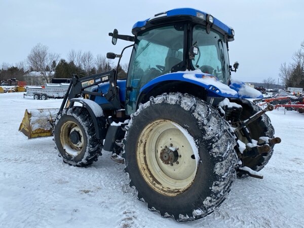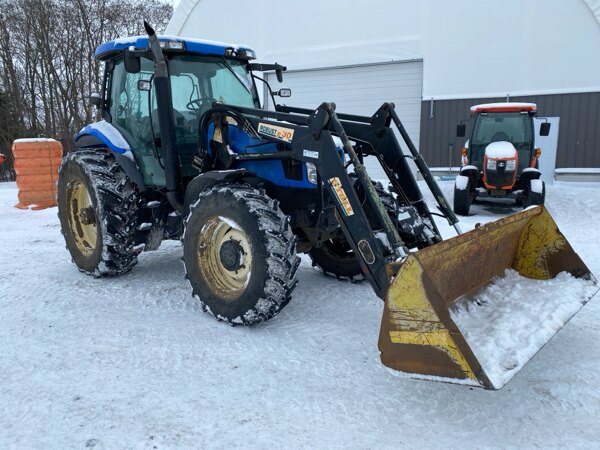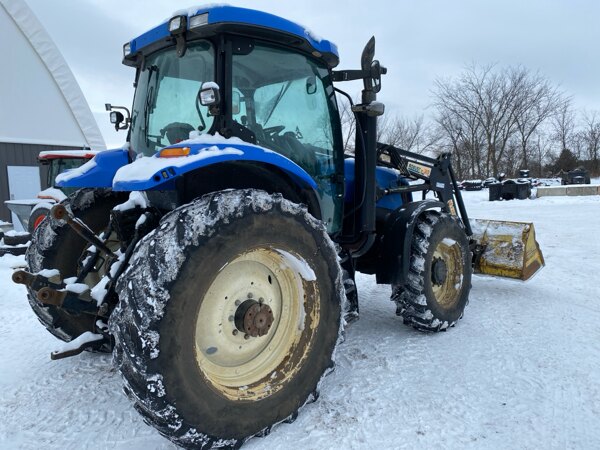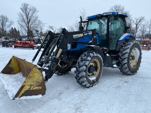 Used New Holland TS115A 4wd tractor with 16x16npowershift transmission, clutchless shuttle, 5900hrs, 4nrear remotes, stoll front end loader with alo quicknhitch, 84" bucket, factory cab