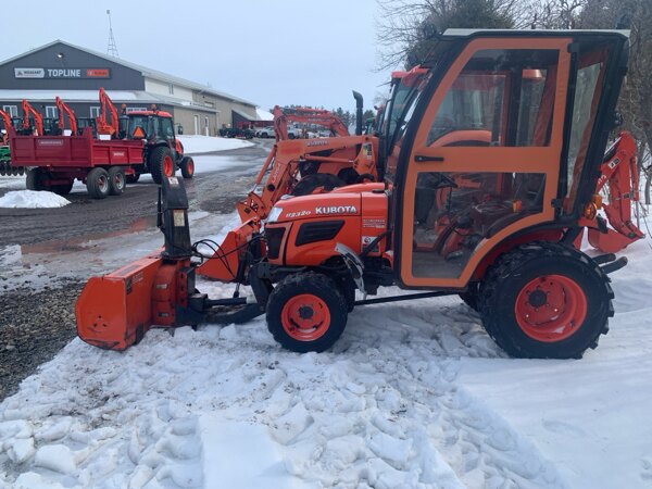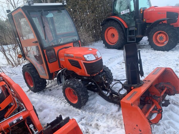 Used 2013 Kubota B2320 Compact Tractor, 23hp, 3 cylinderndiesel, 4wd, industrial r4 tires, bx2750d 51" frontnmount snow blower, curtis cab